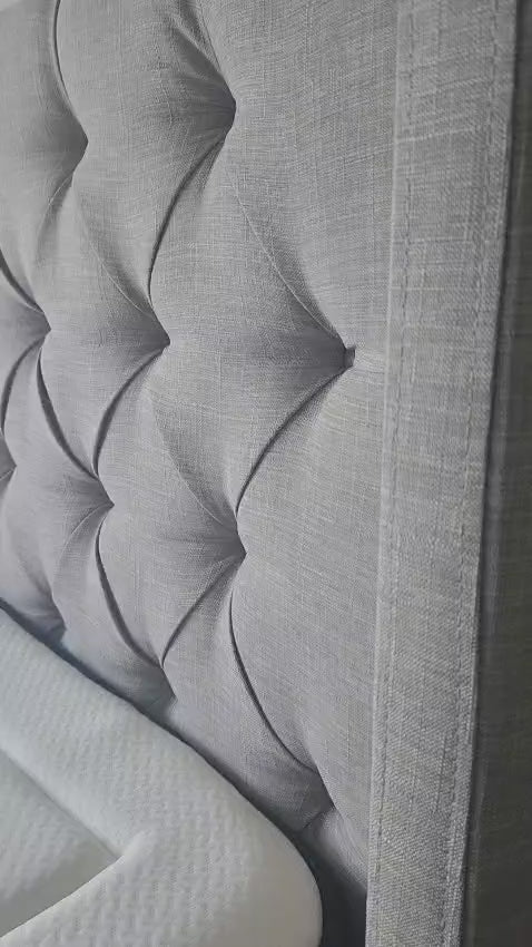 • Tufted Premium Linen Upholstery – Upholstered in tufted cushioned light grey linen, delivering a rich Chesterfield designer look of sophistication and ultimate comfort to your bedroom.